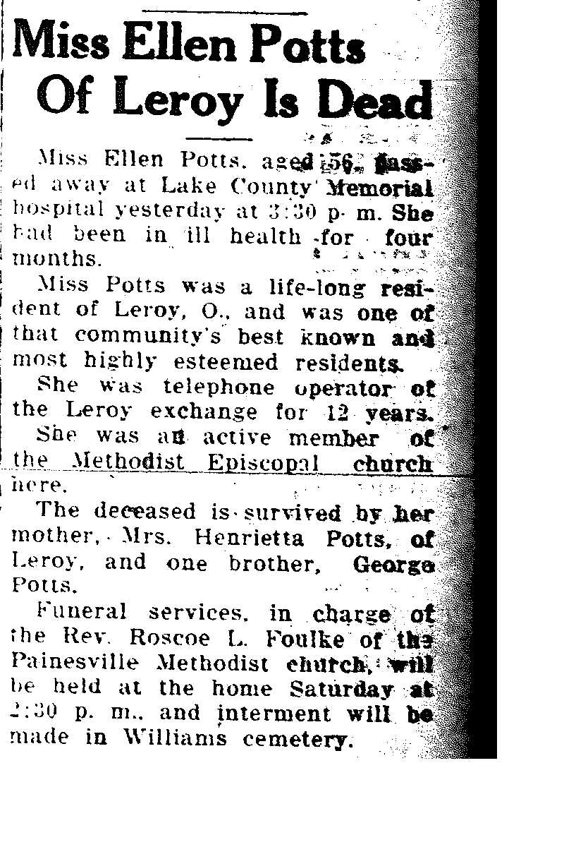 Potts, Ellen Obituary, Potts, Ellen Obituary (Telegraph 07/16/1926)